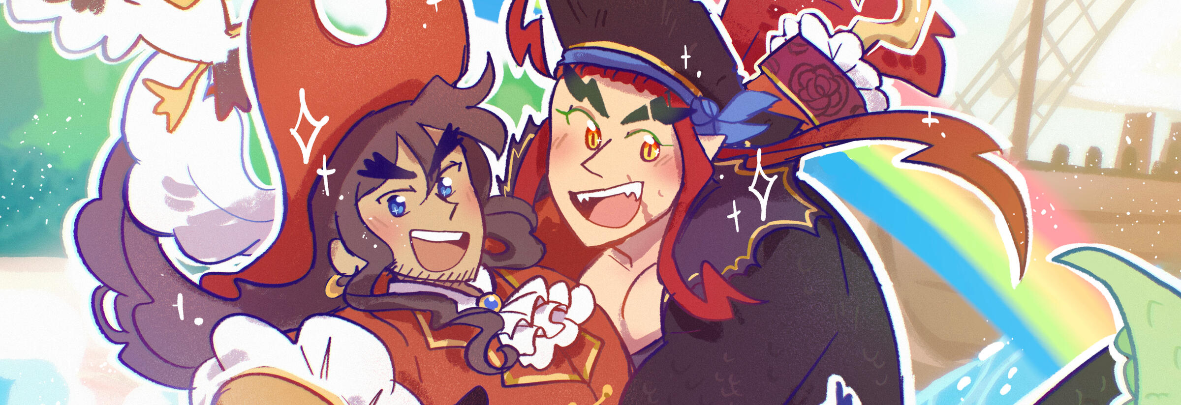 Captain Jack Scarborough Hook is a 3rd year student and is the school’s one and only dashing, chivalrous, and eccentric pirate captain. He runs his own club, Hook’s Grand Adventure, a pirate larp club for everyone to have fun in! He’s a big kid at heart who loves dreaming big and imagining all sorts of adventures. Hook never wants to grow up.In reality, Hook is a chuunibyou student who’s real name is James Beckett. Rarely seen outside of his Hook persona, James is a more reserved, shy man who’s more than a little nervous and unsure of himself.